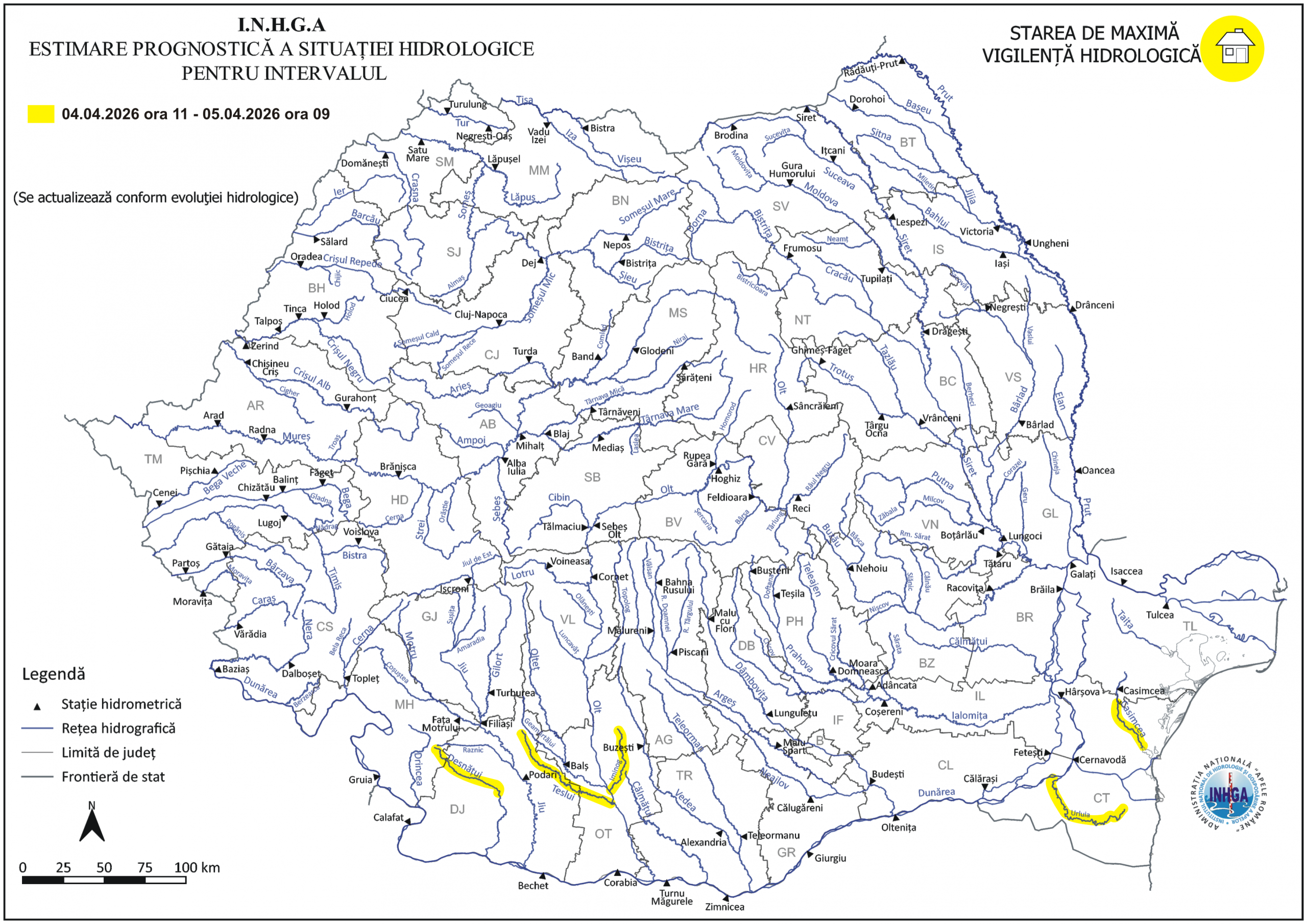 Având în vedere situaţia hidrometeorologică actuală şi prognoza meteorologică pentru următoarele 24 de ore, ca urmare a precipitaţiilor prognozate şi propagării, se actualizează Avertizarea Hidrologică nr. 36 din 03.04.2025 şi mesajele de Atenţionări Hidrologice pentru fenomene imediate în vigoare, după cum urmează: