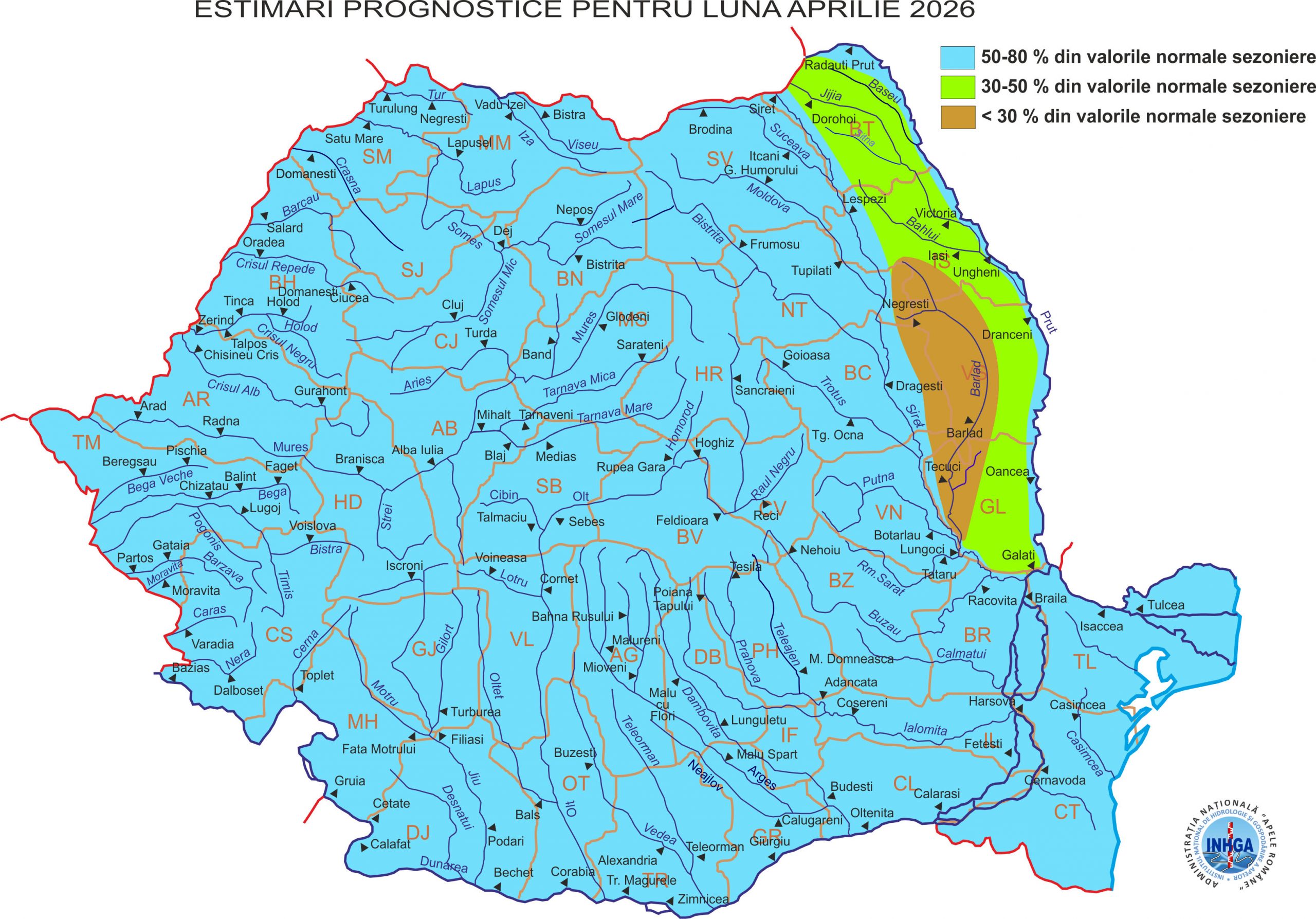 În luna aprilie 2026 regimul hidrologic se va situa la valori cuprinse între 50-80% din mediile multianuale lunare, mai mici (30-50%) pe afluenţii Prutului și sub 30% pe râurile din bazinul Bârlad.