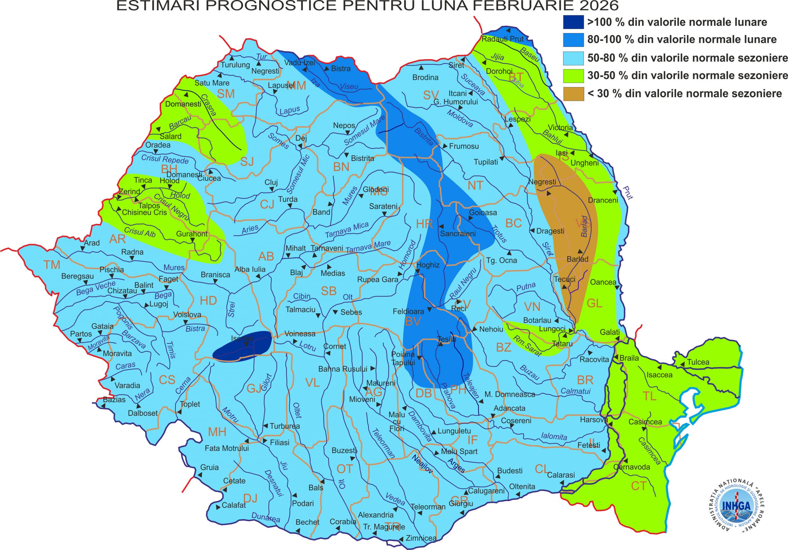 În luna februarie 2026 regimul hidrologic se va situa, în general, la valori cuprinse între 50-80% din mediile lunare multianuale, mai mari (80-100%) pe râurile din bazinele hidrografice: Vișeu, Iza, bazinele superioare ale Oltului, Bistriței, Trotușului, Buzăului, Prahovei, Ialomiţei și pe cursul superior al Prutului şi mai mici (30-50%) pe râurile din bazinele hidrografice: Crasna, Barcău, Crișul Negru, Crișul Alb, Rm. Sărat, afluenţii Prutului și pe râurile din Dobrogea. Valori peste mediile lunare mulianuale se vor înregistra în bazinul superior al Jiului, iar cele mai mici valori (sub 30%) pe râurile din bazinul Bârlad.