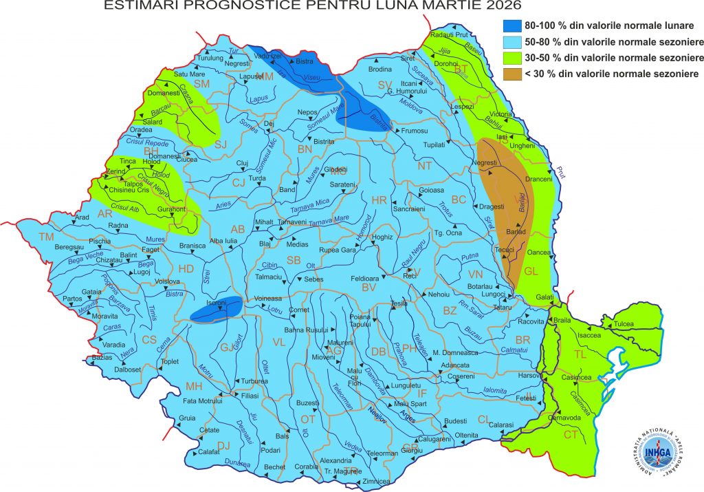 În luna martie 2026 regimul hidrologic se va situa, în general, la valori cuprinse între 50-80% din mediile lunare multianuale, mai mari (80-100% din normalele lunare) pe râurile din bazinele hidrografice: Vișeu, Iza, bazinele superioare ale Jiului și Bistriței şi mai mici (30-50%) pe râurile din bazinele hidrografice: Crasna, Barcău, Crișul Negru, Crișul Alb, afluenţii Prutului și pe râurile din Dobrogea. Cele mai mici valori (sub 30%) se vor înregistra pe râurile din bazinul Bârlad.