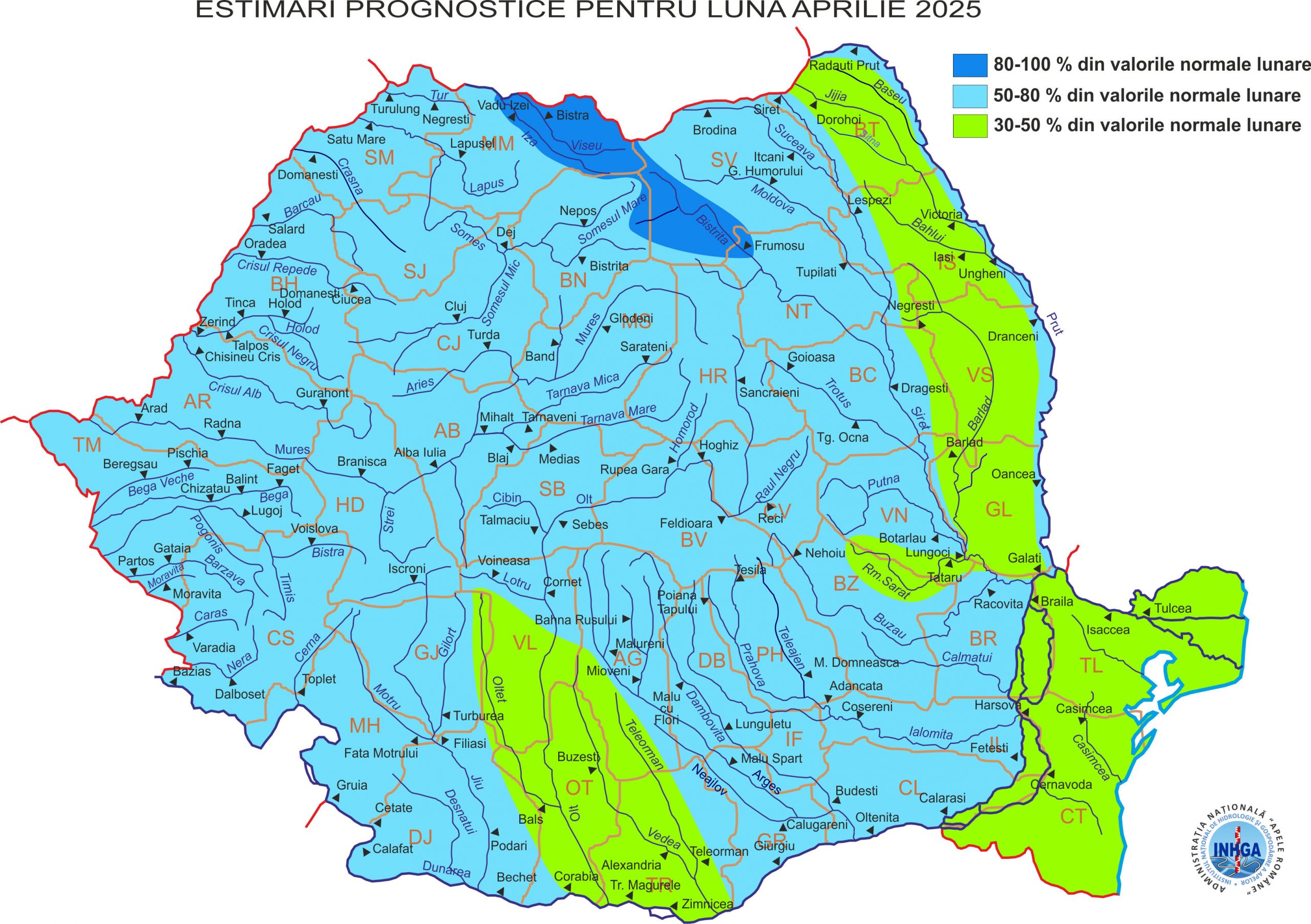 În luna aprilie 2025 regimul hidrologic se va situa la valori cuprinse între 50-80% din mediile multianuale lunare, mai mari (80-100%) pe râurile din bazinele hidrografice: Vișeu, Iza, Someșul Mare și Bistriţa superioară și mai mici (30%-50%) pe râurile din bazinele hidrografice: Olt inferior, Vedea, Rm. Sărat, Bârlad, afluenţii Prutului și râurile din Dobrogea.