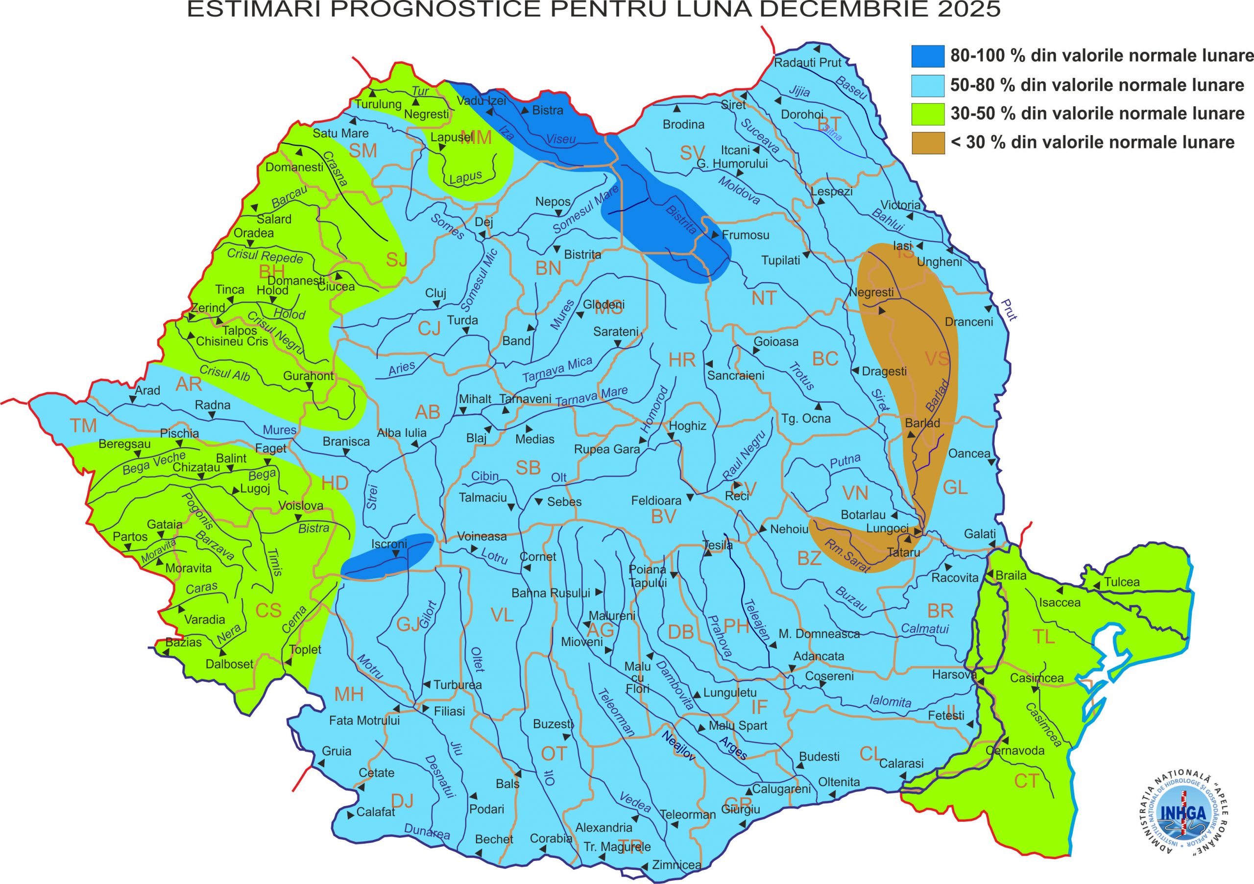 În luna decembrie 2025 regimul hidrologic se va situa la valori cuprinse între 50-80% din mediile lunare multianuale, mai mari (80-100%) pe râurile din bazinele hidrografice: Vișeu, Iza, bazinul superior al Jiului și în bazinul superior și mijlociu al Bistriţei (afluent al râului Siret) și mai mici (30-50%) pe râurile din bazinele hidrografice: Tur, Lăpuș, Crasna, Barcău, Crișuri, Bega Veche, Bega, Timiș, Bârzava, Moraviţa, Caraș, Nera, Cerna și pe râurile din Dobrogea. Cele mai mici valori (sub 30% din normalele lunare) se vor înregistra pe râurile din bazinele hidrografice:  Rm. Sărat și Bârlad.