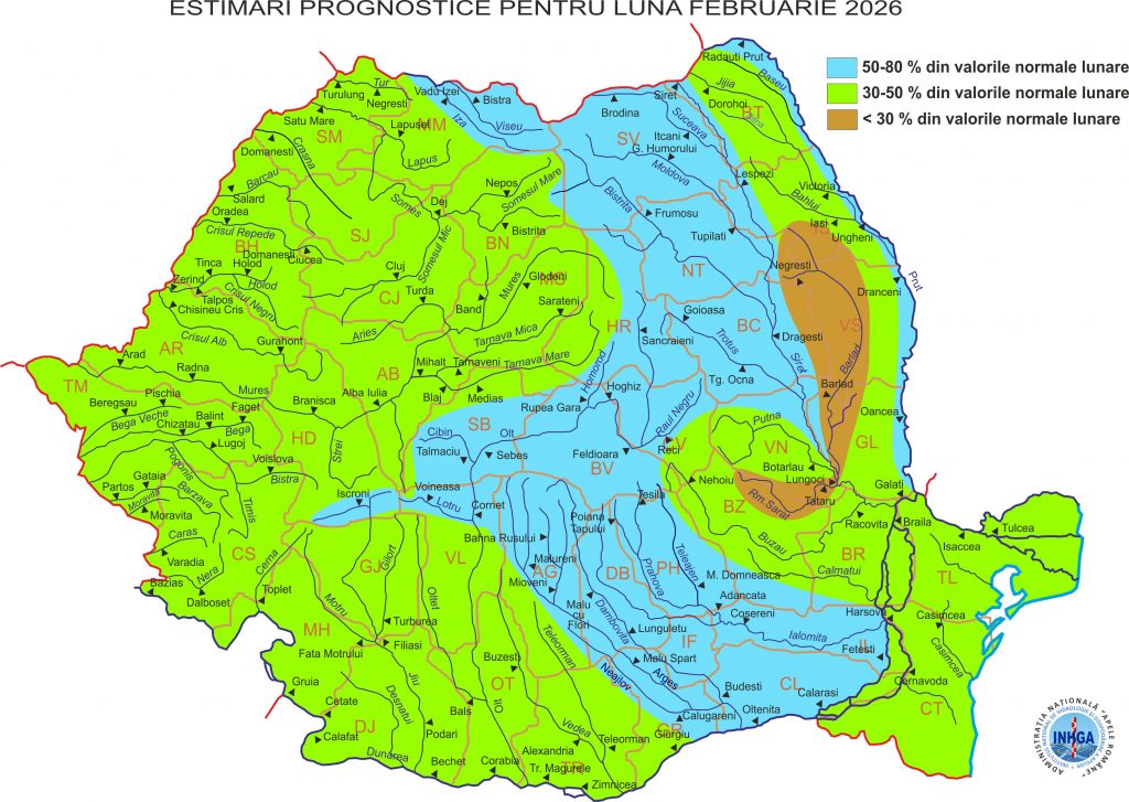 În luna februarie 2026 regimul hidrologic se va situa la valori cuprinse între 30-50% din mediile multianuale lunare, mai mari (50-80%) pe râurile din bazinele hidrografice: Vișeu, Iza, Jiu superior, Olt superior și mijlociu, Argeș, Ialomiţa, Trotuș, Bistrița, Moldova, Suceava, pe cursurile Siretului şi Prutului şi mai mici (sub 30% din normalele lunare) pe râurile din bazinele hidrografice: Rm. Sărat și Bârlad.