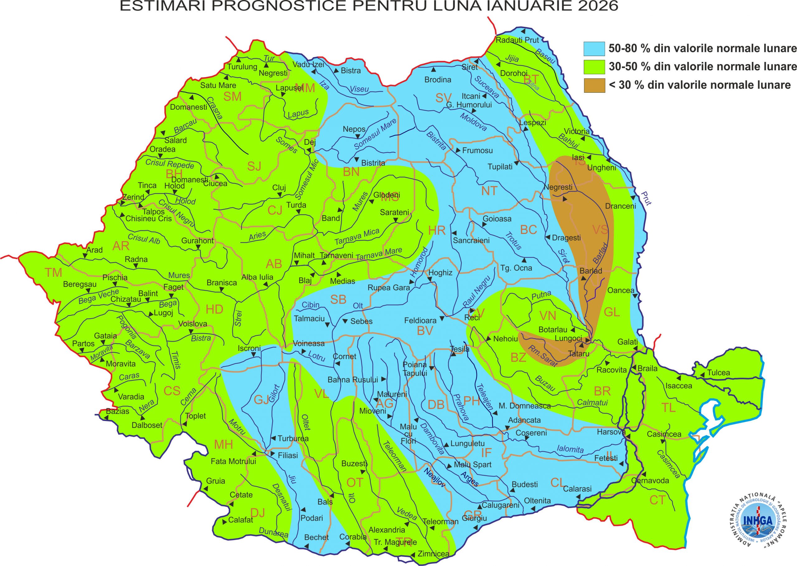 În luna ianuarie 2026 regimul hidrologic se va situa la valori cuprinse între 30-50% din mediile lunare multianuale, mai mari (50-80%) pe râurile din bazinele hidrografice: Vișeu, Iza, Someșul Mare, Jiu (exceptând râul Motru), Olt superior și mijlociu, Argeș, Ialomiţa, Trotuș, Bistrița, Moldova, Suceava şi pe cursurile Siretului şi Prutului şi mai mici (sub 30% din normalele lunare) pe râurile din bazinele hidrografice: Rm. Sărat și Bârlad.