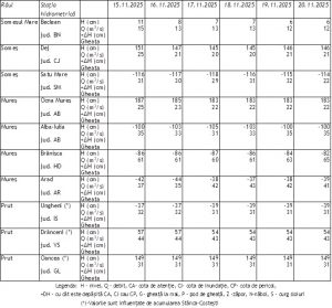 Debitele medii zilnice, vor fi în general staționare, exceptând primele două zile ale intervalului de prognoză, când vor fi în scădere pe râurile din sudul țării.