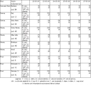 Sunt posibile creșteri de niveluri și debite, pe unele râuri mici din zonele de deal și de munte, mai ales în prima parte a intervalului pe cele din jumătatea de est a țării, ca urmare a precipitațiilor prognozate, cedării apei din stratul de zăpadă și propagării.