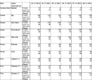 Debitele medii zilnice vor fi în general în scădere, exceptând râurile din sudul țării unde vor fi staționare, iar spre sfârșitul intervalului vor fi, în general, în creștere datorită precipitațiilor lichide prognozate, cedării apei din stratul de zăpadă și propagării.