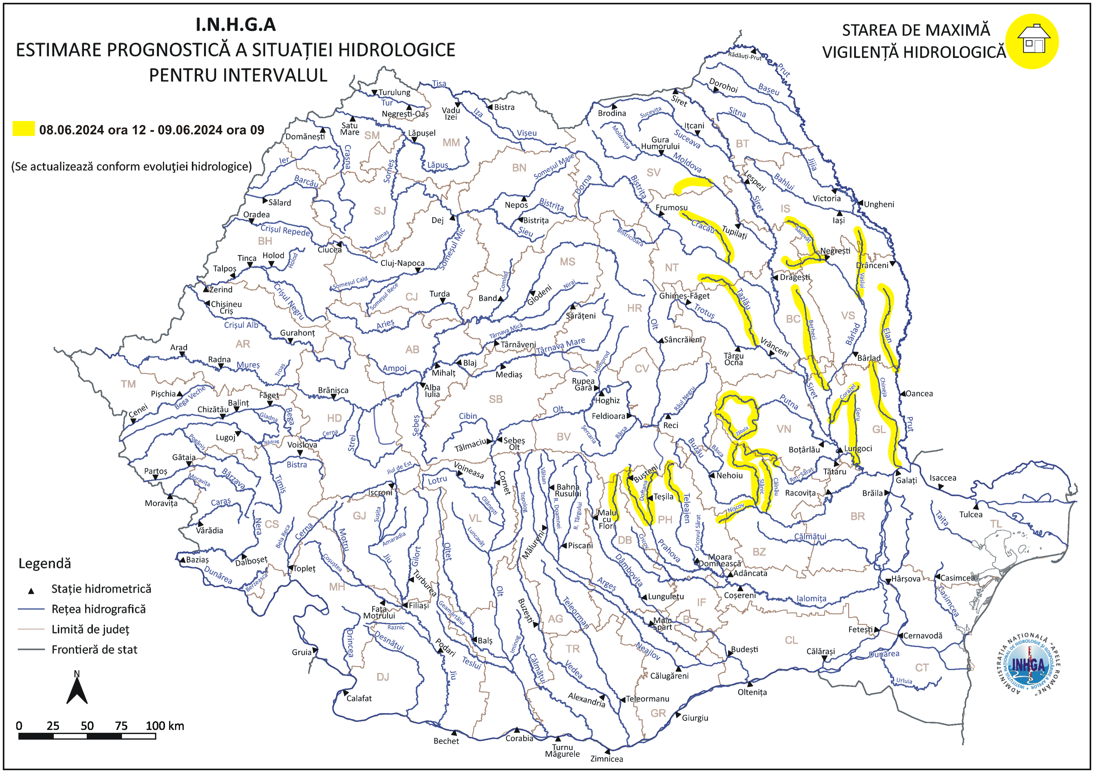 MOMENTUL PRODUCERII FENOMENELOR VIZATE:Data: 08.06.2024 ora 12:00 – 09.06.2024 ora 09:00Având în vedere situaţia hidrometeorologică actuală şi prognoza meteorologică pentru următoarele 24 de ore, ca urmare a precipitaţiilor prognozate şi propagării, se pot produce scurgeri importante pe versanţi, torenţi şi pâraie, viituri rapide pe râurile mici cu posibile efecte de inundaţii locale şi creşteri de debite şi niveluri pe unele râuri din bazinele hidrografice menţionate, cu posibile depăşiri ale COTELOR DE ATENŢIE, după cum urmează: COD GALBENÎn intervalul 08.06.2024 ora 12:00 – 09.06.2024 ora 09:00 pe râurile din bazinele hidrografice: Ialomiţa – bazin amonte S.H. Târgovişte (judeţele: Dâmbovița şi Prahova), Prahova – bazin superior, Teleajen – bazin superior (judeţul Prahova), Buzău – afluenţii aferenţi sectorului aval S.H. Nehoiu (judeţele: Buzău, Prahova şi Brăila), Râmnicu Sarat – bazin superior şi afluenţi bazin mijlociu şi inferior (judeţele: Buzău şi Vrancea), Putna – bazin superior şi afluenţi bazin mijlociu şi inferior (judeţul Vrancea), Trotuş – afluenţii aferenţi sectorului aval S.H. Târgu Ocna (judeţele: Bacău, Neamţ, Covasna şi Vrancea), Bistriţa – afluenţii aferenţi sectorului aval S.H. Straja (judeţele: Neamţ şi Bacău), Moldova – afluenţii aferenţi sectorului aval S.H. Gura Humorului (judeţele: Suceava şi Neamţ), Bârlad – bazin amonte S.H. Negreşti şi afluenţii aferenţi sectorului aval S.H. Negreşti (judeţele: Neamţ, Vaslui, Iaşi, Galaţi, Bacău şi Vrancea), Siret – afluenţii mici aferenţi sectorului aval S.H. Nicolae Bălcescu (judeţele: Neamţ, Bacău, Vrancea şi Galaţi), Prut – afluenţii aferenţi sectorului aval S.H. Drânceni (judeţele: Vaslui şi Galaţi). Atenționarea Hidrologică vizează în principal fenomenele de scurgeri importante pe versanţi, torenţi şi pâraie, viituri rapide pe râurile mici cu posibile efecte de inundaţii locale, care se pot produce cu probabilitate şi intensitate mai mare pe unele râuri mici din judeţele: Neamţ, Bacău, Vaslui şi Vrancea. Harta cu codurile se anexează. Se menționează că fenomenele hidrologice periculoase se pot produce mai ales pe afluenții de grad inferior ai râurilor marcate pe hartă. În funcție de evoluția fenomenelor hidrometeorologice vom reveni cu actualizarea prognozei hidrologice. Se impune urmărirea evoluției situației hidrometeorologice, în conformitate cu ”Regulamentul privind gestionarea situaţiilor de urgenţă generate de fenomene hidrometeorologice periculoase având ca efect producerea de inundații, secetă hidrologică precum și incidente/accidente la construcții hidrotehnice, poluări accidentale ale cursurilor de apă și poluări marine în zona costieră”. |