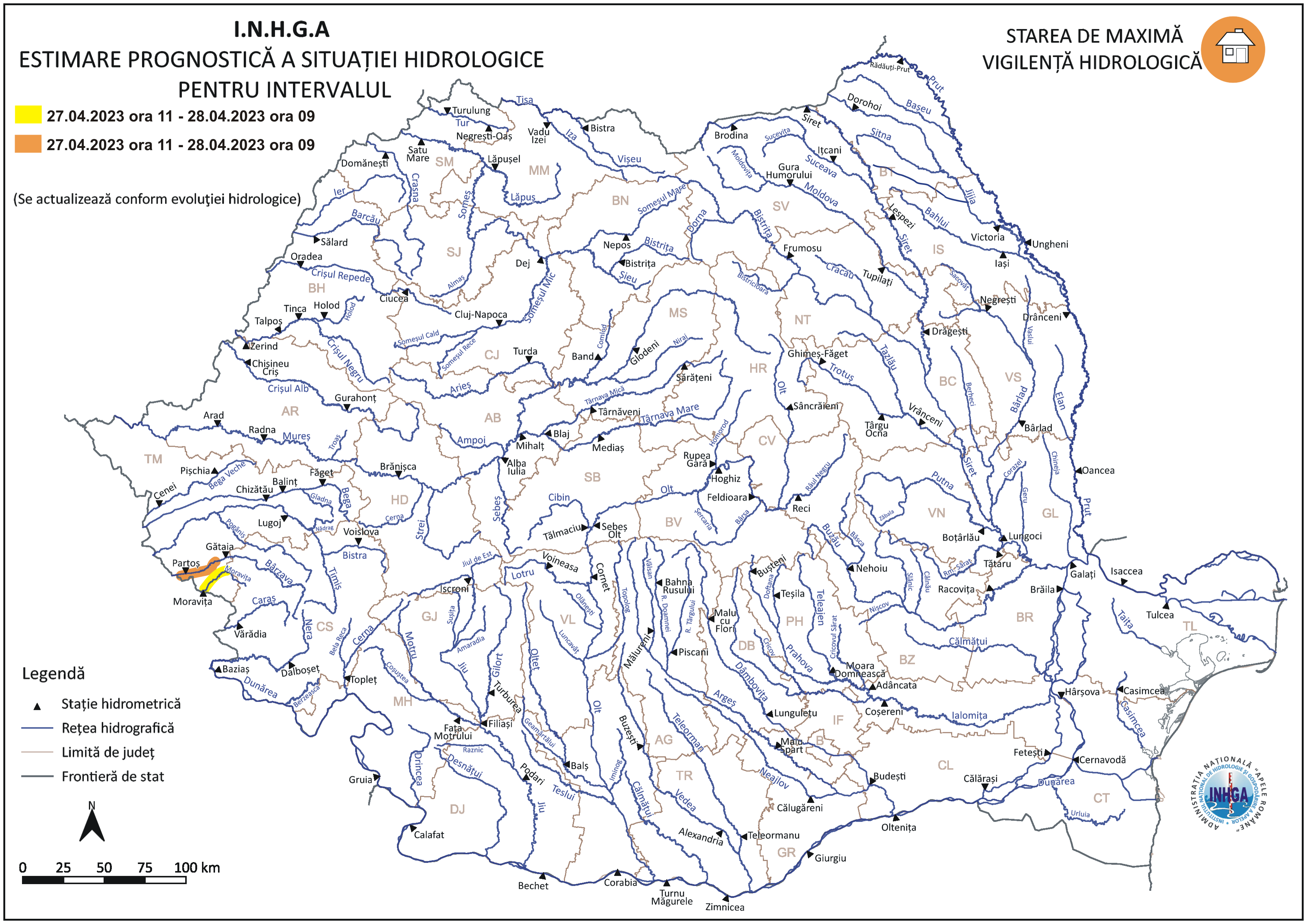 MOMENTUL PRODUCERII FENOMENELOR VIZATE: Data: 27.04.2023 ora 11:00 – 28.04.2023 ora 09:00 Având în vedere situaţia hidrometeorologică actuală şi prognoza meteorologică pentru următoarele 24 de ore, se actualizează Avertizarea Hidrologică nr. 44 din 26.04.2023, după cum urmează: COD GALBEN În intervalul 27.04.2023 ora 11:00 – 28.04.2023 ora 09:00 ca urmare a propagării viiturilor formate anterior în amonte, pe râul Moraviţa – curs inferior (sector îndiguit – judeţul Timiş). COD PORTOCALIU În intervalul 27.04.2023 ora 11:00 – 28.04.2023 ora 09:00, ca urmare a propagării viiturilor formate anterior în amonte, pe râul Bârzava – sector aval S.H Gătaia (sector îndiguit – judeţul Timiş). Se ridică începând cu data de 27.04.2023 ora 11:00 Avertizarea Hidrologică din celelalte bazine hidrografice avertizate anterior. Harta cu codurile se anexează. În funcție de evoluția fenomenelor hidrometeorologice vom reveni cu actualizarea prognozei hidrologice. Se impune urmărirea evoluției situației hidrometeorologice, în conformitate cu ”Regulamentul privind gestionarea situaţiilor de urgenţă generate de fenomene hidrometeorologice periculoase având ca efect producerea de inundații, secetă hidrologică precum și incidente/accidente la construcții hidrotehnice, poluări accidentale ale cursurilor de apă și poluări marine în zona costieră”. |