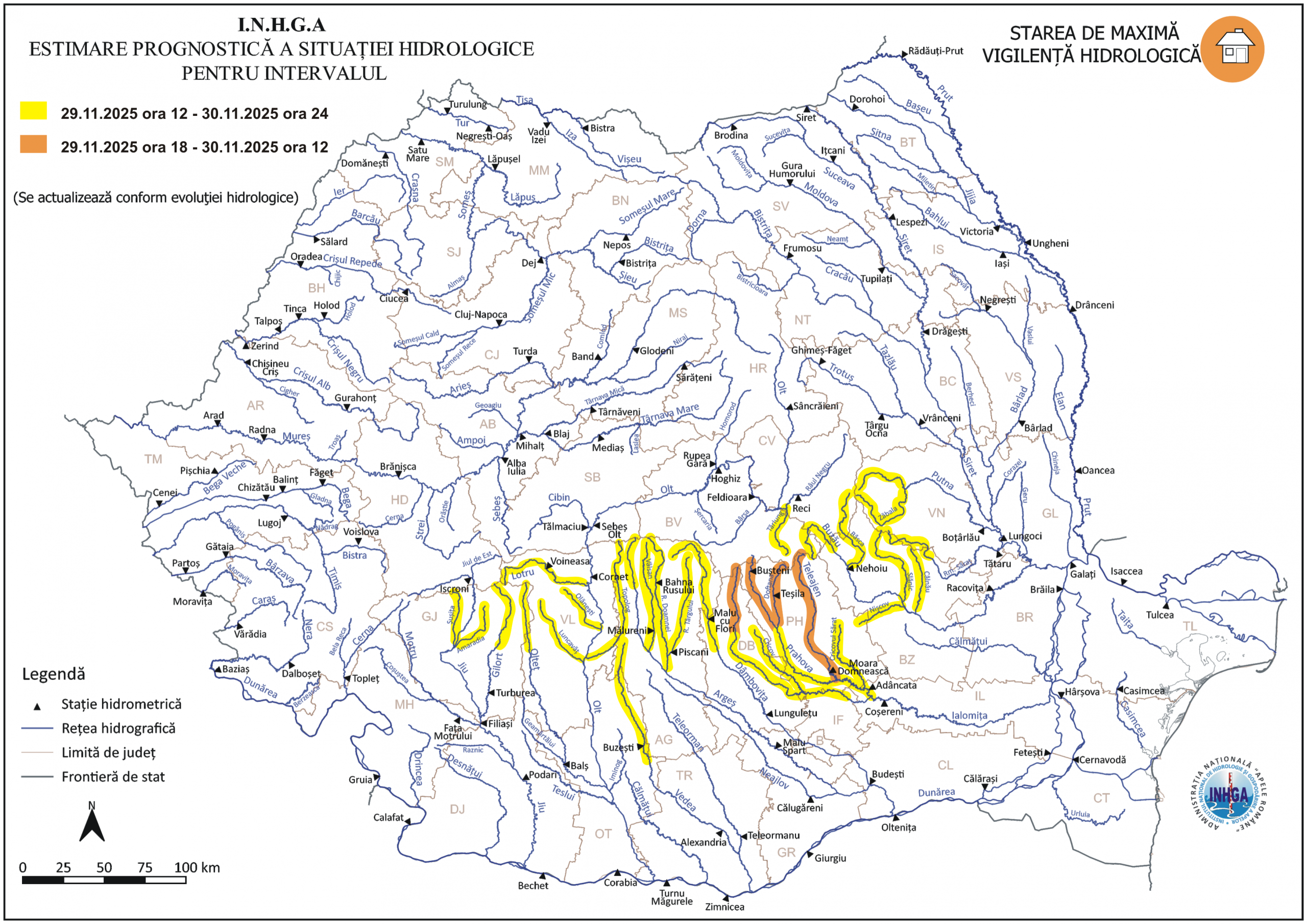 În intervalul 29.11.2025 ora 12:00 – 30.11.2025 ora 24:00 pe râurile din bazinele hidrografice: Jiu – afluenţii aferenţi sectorului aval S.H. Sadu – amonte confluenţă cu râul Gilort, Gilort – bazin superior şi afluenţi bazin mijlociu şi inferior (judeţul Gorj), Tărlung – afluent al râului Râul Negru (judeţele: Braşov și Covasna), Olt – afluenţii aferenţi sectorului aval confluenţă cu râul Cibin – amonte confluenţă cu râul Olteţ (judeţele: Sibiu, Vâlcea, Argeş şi Olt), Olteţ – bazin superior şi afluenţi bazin mijlociu (judeţele: Gorj şi Vâlcea), Vedea – bazin superior (judeţele: Argeş şi Olt), Argeş – bazin superior, Dâmboviţa – bazin superior (judeţele: Argeş şi Dâmboviţa), Ialomiţa – bazin amonte S.H. Siliştea Snagovului (judeţele: Dâmboviţa, Prahova şi Ilfov), Prahova (judeţele: Prahova şi Ialomiţa), Buzău – bazin amonte Ac. Siriu şi afluenţii aferenţi sectorului aval Ac. Siriu – amonte S.H. Baniţa (judeţele: Braşov, Covasna, Buzău şi Prahova), Râmnicu Sărat – bazin superior şi afluenţi bazin mijlociu şi inferior (judeţele: Vrancea şi Buzău), Putna – bazin superior şi afluenţi bazin mijlociu şi inferior (judeţul Vrancea).