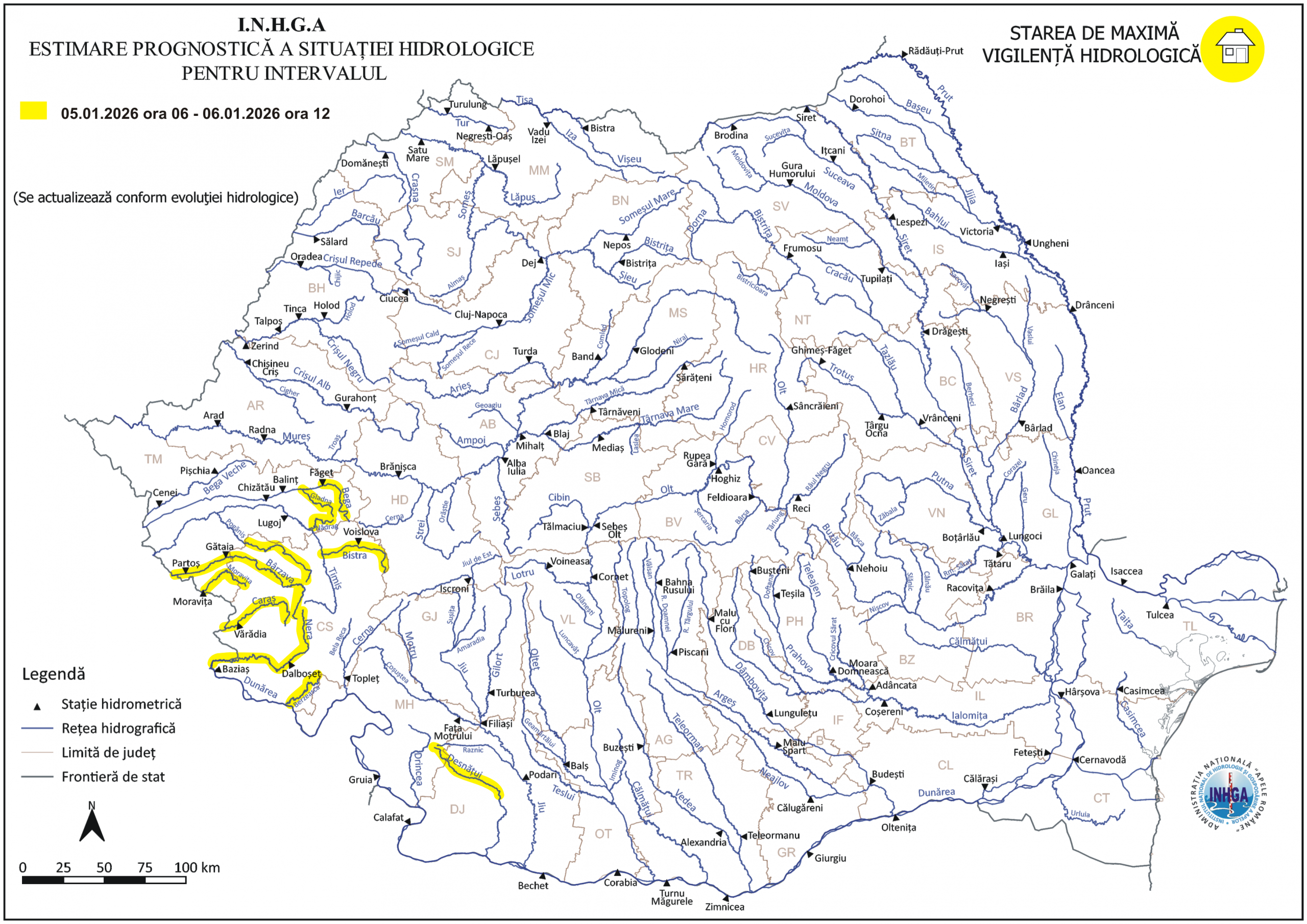 În intervalul 05.01.2026 ora 06:00 – 06.01.2026 ora 12:00 pe râurile din bazinele hidrografice: Bega – bazin amonte S.H. Făget şi afluenţii aferenţi sectorului aval S.H. Făget – amonte S.H. Chizătău (judeţele: Timiş şi Arad), Timiş – afluenţii aferenţi sectorului aval S.H. Sadova – amonte S.H. Lugoj, Pogăniş – bazin amonte Ac. Cadar Duboz, Bârzava, Moraviţa (judeţele: Caraş Severin şi Timiş), Caraş, Nera (judeţul Caraş Severin), Dunăre – afluenţii mici aferenţi sectorului amonte confluenţă cu râul Cerna (judeţele: Mehedinţi şi Caraş Severin), Desnăţui – bazin amonte Ac. Fântânele (judeţele: Mehedinţi şi Dolj).