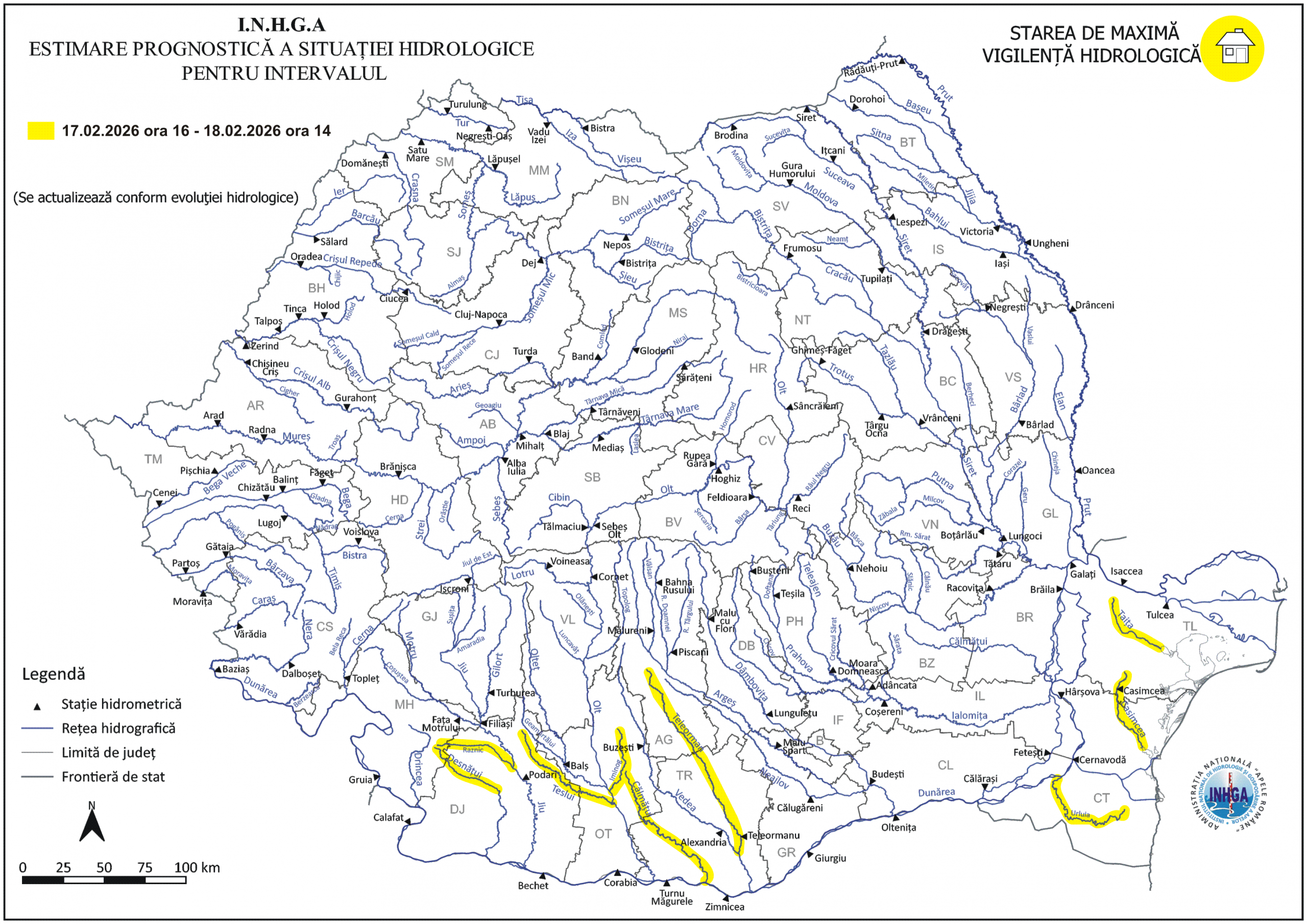 COD GALBEN În intervalul 17.02.2026 ora 16:00 – 18.02.2026 ora 14:00 pe râurile din bazinele hidrografice: Desnăţui – bazin amonte Ac. Fântânele și afluenţii aferenţi sectorului aval Ac. Fântânele (judeţele: Mehedinţi și Dolj), Jiu – afluenţii de dreapta aferenţi sectorului aval confluenţă cu râul Motru – amonte S.H. Podari (judeţele: Mehedinţi și Dolj), Olt – afluenţii aferenţi sectorului aval confluenţă cu râul Olteţ (judeţele: Olt şi Dolj), Călmăţui (judeţele: Olt și Teleorman), Vedea – afluenţii aferenţi sectorului aval confluenţă cu râul Cotmeana (judeţele: Olt, Argeș și Teleorman) și râurile din Dobrogea (judeţele: Constanţa și Tulcea).