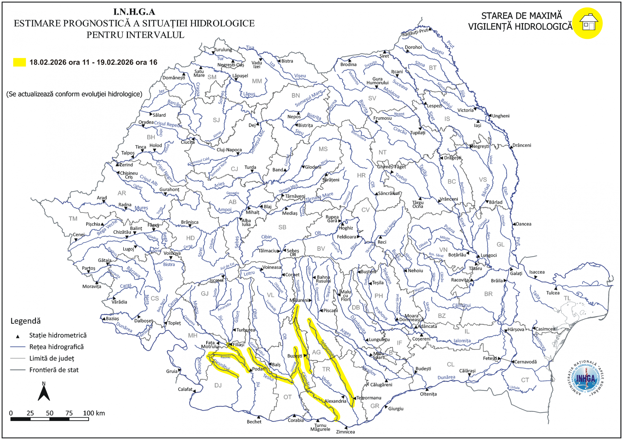 MOMENTUL PRODUCERII FENOMENELOR VIZATE:Data: 18.02.2026 ora 11:00 – 19.02.2026 ora 16:00Având în vedere situaţia hidrometeorologică actuală şi prognoza meteorologică pentru următoarele 24 de ore, ca urmare a precipitaţiilor prognozate, cedării apei din stratul de zăpadă şi propagării, se actualizează Atenţionarea Hidrologică nr.17 din 17.02.2026, după cum urmează: COD GALBENÎn intervalul 18.02.2026 ora 11:00 – 19.02.2026 ora 16:00 pe râurile din bazinele hidrografice: Desnăţui – bazin amonte Ac. Fântânele și afluenţii aferenţi sectorului aval Ac. Fântânele (judeţele: Mehedinţi și Dolj), râul Jiu – pe sectorul aval confluenţă cu râul Motru – amonte S.H. Podari (judeţul Dolj), Jiu – afluenţii de dreapta aferenţi sectorului aval confluenţă cu râul Motru – amonte S.H. Podari (judeţele: Mehedinţi şi Dolj), Olt – afluenţii aferenţi sectorului aval confluenţă cu râul Olteţ (judeţele: Olt şi Dolj), Călmăţui (judeţele: Olt și Teleorman), Vedea – bazin amonte S.H. Văleni și afluenţii aferenţi sectorului aval S.H. Văleni (judeţele: Argeș, Olt și Teleorman).