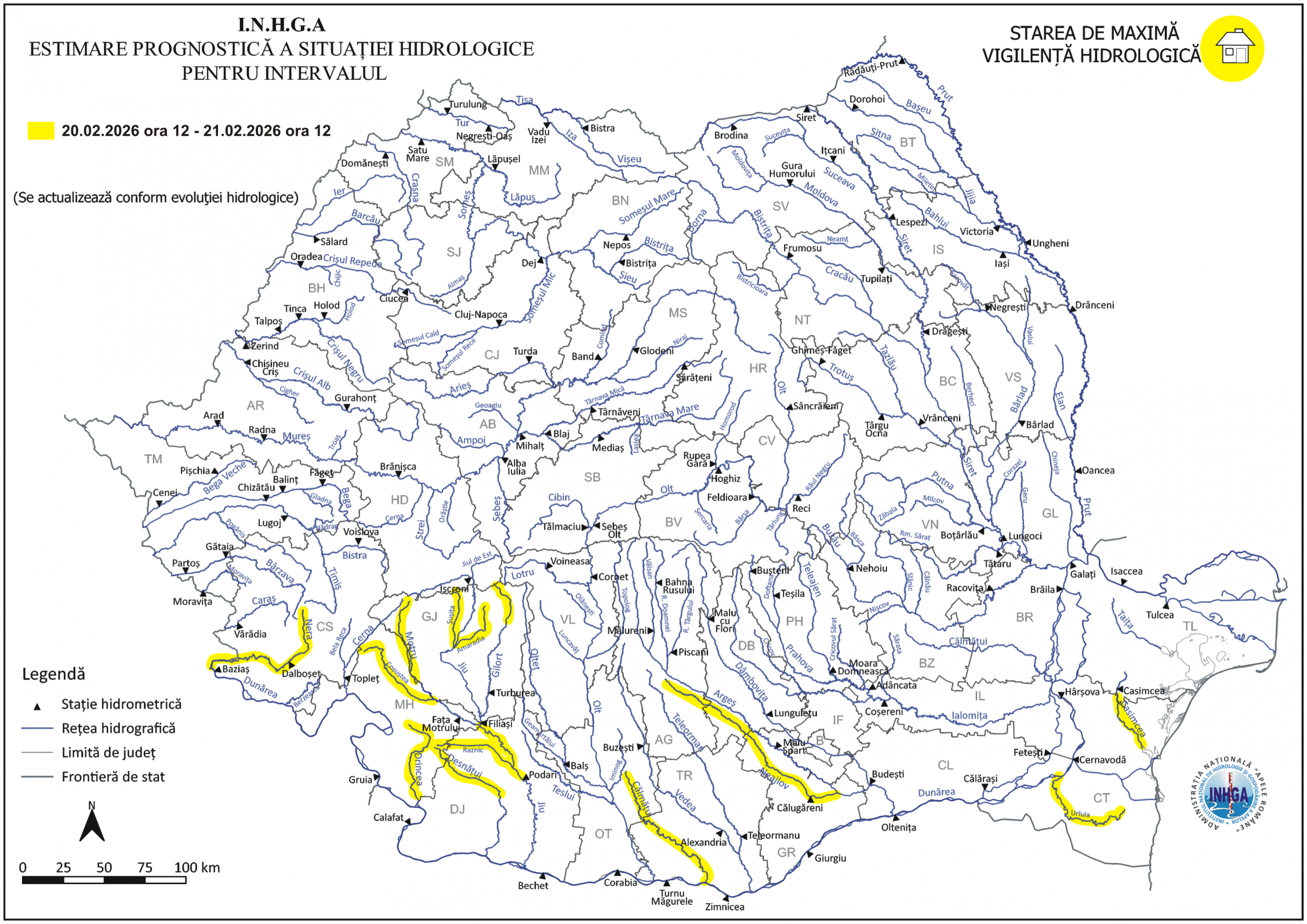 În intervalul 20.02.2026 ora 12:00 – 21.02.2026 ora 12:00 pe râurile din bazinele hidrografice: Nera (judeţul Caraş Severin), Drincea, Desnăţui – bazin amonte Ac. Fântânele (judeţele: Mehedinţi și Dolj), Jiu – afluenţii aferenţi sectorului aval S.H. Sadu – amonte confluenţă cu râul Gilort, Gilort – bazin superior şi afluenţi bazin mijlociu şi inferior (judeţul Gorj), Motru – bazin superior şi afluenţi bazin milociu şi inferior (judeţele: Gorj şi Mehedinţi), râul Jiu – pe sectorul aval confluenţă cu râul Motru – amonte S.H. Podari (judeţul Dolj), Jiu – afluenţii de dreapta aferenţi sectorului aval confluenţă cu râul Motru – amonte S.H. Podari (judeţele: Mehedinţi și Dolj), Călmăţui (judeţele: Olt și Teleorman), Argeş – afluenţii aferenţi sectorului aval S.H. Malu Spart – amonte S.H. Budeşti (judeţele: Argeș, Dâmboviţa, Teleorman, Giurgiu şi Ilfov), râurile din judeţul Constanţa.