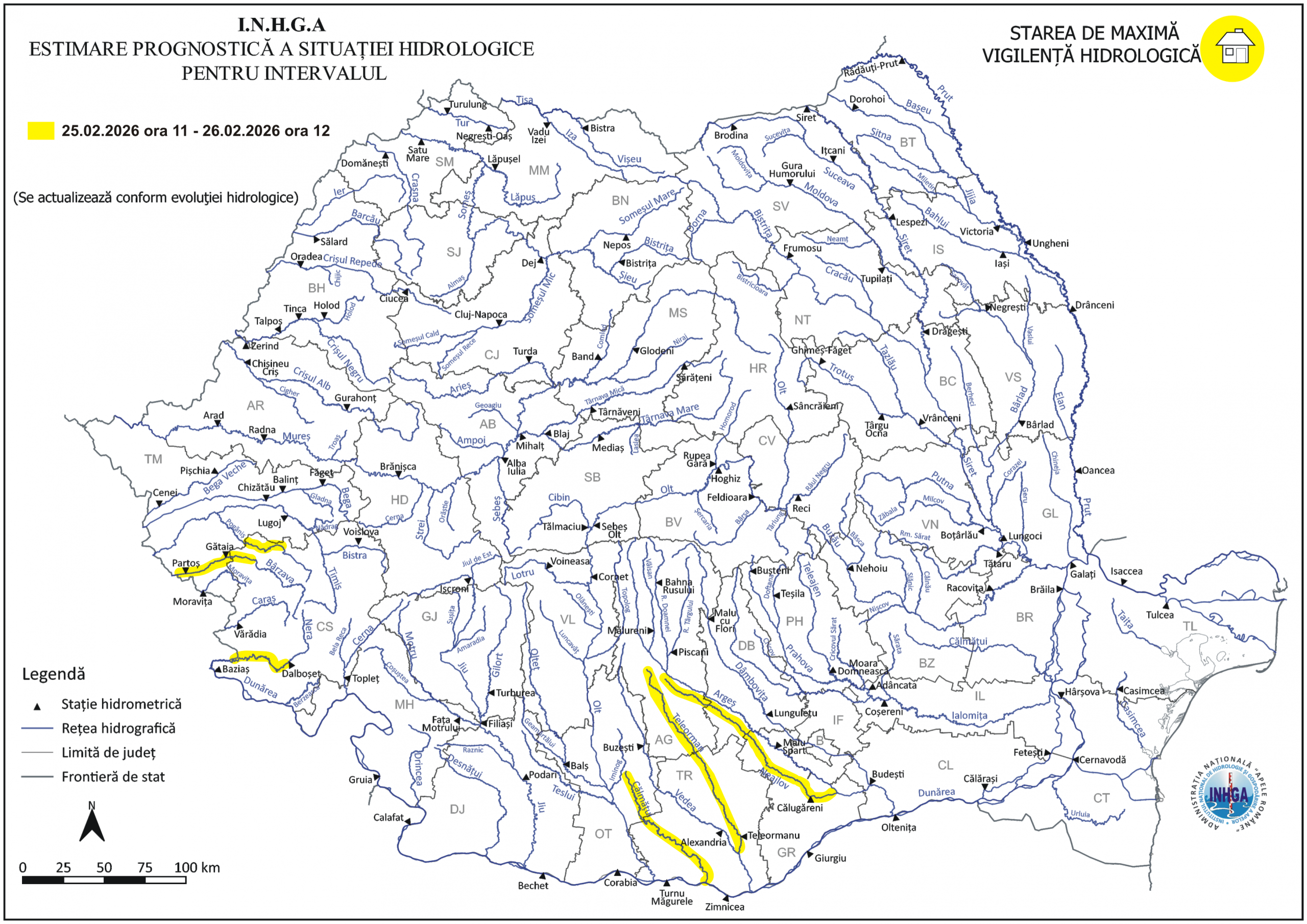 MOMENTUL PRODUCERII FENOMENELOR VIZATE: Data: 25.02.2026 ora 11:00 – 26.02.2026 ora 12:00 Având în vedere situaţia hidrometeorologică actuală şi prognoza meteorologică pentru următoarele 24 de ore, ca urmare a propagării, cedării apei din stratul de zăpadă şi precipitaţiilor prognozate, se actualizează Atenţionarea Hidrologică nr.24 din 24.02.2026 şi Atenţionările Hidrologice pentru Fenomene Imediate în vigoare, după cum urmează: