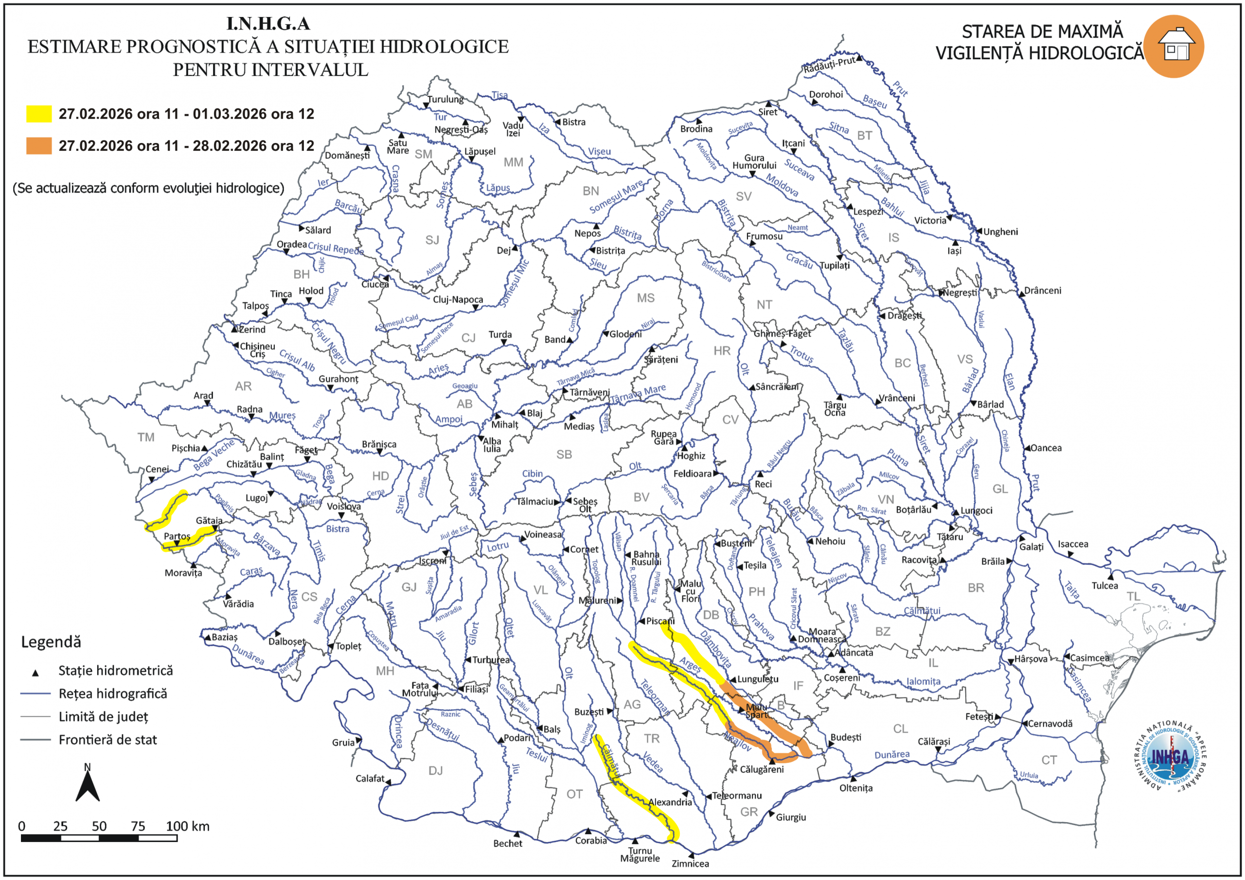MOMENTUL PRODUCERII FENOMENELOR VIZATE: Data: 27.02.2026 ora 11:00 – 01.03.2026 ora 12:00 Având în vedere situaţia hidrometeorologică actuală şi prognoza meteorologică pentru următoarele 48 de ore, ca urmare a propagării viiturilor formate anterior în amonte şi cedării apei din stratul de zăpadă, se actualizează Avertizarea Hidrologică nr. 26 din 26.02.2026, după cum urmează: